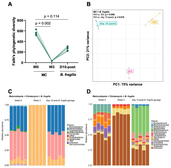 Transplantation of B. fragilis into MC-treated mice. (A) α-diversity measured using Faiths’ phylogenetic index. p values for comparison between the baseline and the different time points are shown. (B) Principal coordinate analysis plots illustrating differences in β-diversity based on weighted Unifrac. stacked relative abundance plots at the (C) genus level and (D) phylum level. (n = 5 mice/group).