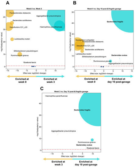 Volcano plots depicting differentially abundant taxa following transplantation of B. fragilis into MC-treated mice as determined by DESeq2 at (A) week 0 versus week 3, (B) week 0 vs. day 10 post-treatment, and (C) week 3 versus day 10 post-treatment. Significantly more discriminatory taxa appear closer to the left or right and are above the threshold (red dotted line, false discovery rate = 0.2). Relative abundance of taxa is indicated by circle size. Bacteroides spp. is bolded.