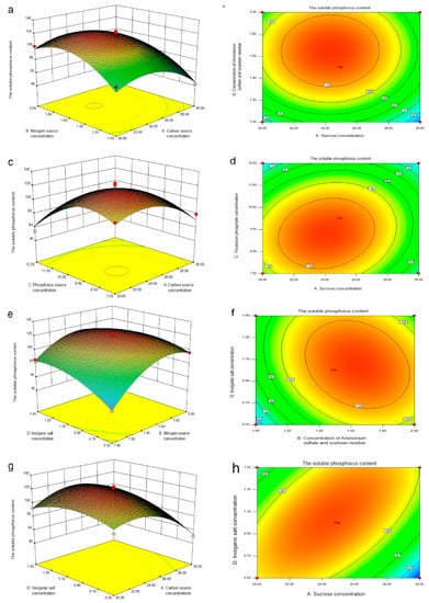 The phosphorus-solubilizing process is a complex phenomenon, which mainly depends on many other factors such as the nutritional richness of soils and the growth dynamics and physiological functions of the PSMs [44]. Moreover, the performance of PSMs has also been found to be severely affected by the composition and proportion of the medium culture [45], such as the types of carbon sources and their concentrations [46], the types of nitrogen sources [47], etc. Recently, studies have focused on isolating and screening PSMs from different rhizosphere soils and then they have evaluated their phosphate-solubilizing capacities in vitro [48,49]. However, there are few reports regarding the impacts of medium culture on the development of growth and the phosphate-solubilizing activities of PSMs. The response surface method (RSM) and statistical methods have been increasingly used to predict mathematical models to evaluate the responses of dependent variables to selected factors (independent and predictive variables). RSM is widely used in modeling processes that are affected by multiple independent variables, with the goal of optimizing the process [50].