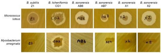 To study the growth inhibition of Micrococcus luteus and Mycobacterium smegmatis, aliquots of 5 µL of each of the Bacillus isolates were added onto the surface of TSA plates containing 108 CFU × mL−1 of the respective indicator strain. Plates were incubated at 30 °C until visible halos of inhibition appeared.