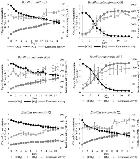 Growth and keratinase activity of the Bacillus isolates on chicken feathers as sole carbon and nitrogen source. Samples for growth (CO2 production and O2 consumption) and keratinase activity were collected every 24 h until O2 was depleted from the bottles or until when 20 days were reached. Vertical error bars correspond to the standard error of the mean of three replicated experiments.