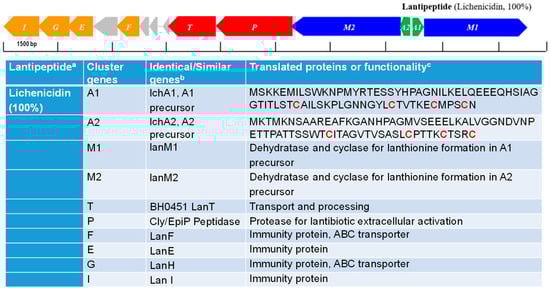 - Barbosa, J.C.; Silva, Í.C.; Caetano, T.; Mösker, E.; Seidel, M.; Lourenço, J.; Süssmuth, R.D.; Santos, N.C.; Gonçalves, S.; Mendo, S. Assessing the potential of the two-peptide lantibiotic lichenicidin as a new generation antimicrobial. World J. Microbiol. Biotechnol. 2022, 38, 18. [Google Scholar] [CrossRef]