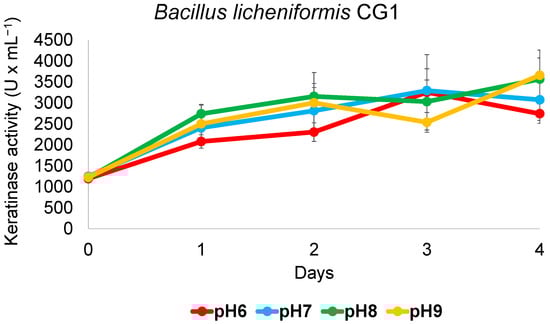 Factors such as microbial strain, medium composition, pH and temperature play major roles in the production of highly active keratinase enzyme. As we have shown, B. licheniformis CG1 displays the most interesting antimicrobial potential and the highest keratinase activity among the Bacillus isolates. Therefore, this strain would be a good candidate for biotechnological applications in feather valorization. For industrial approaches, it is important that the employed strain remains active across a range of pH, among other parameters. To study this, keratin degradation using smaller bottles and less volume of medium (20 mL instead of 200 mL) at pH values from 6 to 9 was performed. As is shown in Figure 5, the strain showed a similar keratinase activity with all pH values tested, reaching around 3000 units per mL in just 2–4 days, which might provide an advantage for further industrial applications.