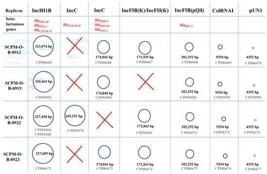 Plasmids identified in K. pneumoniae strains SCPM-O-B-8912, SCPM-O-B-8919, SCPM-O-B-8922, and SCPM-O-B-8923.