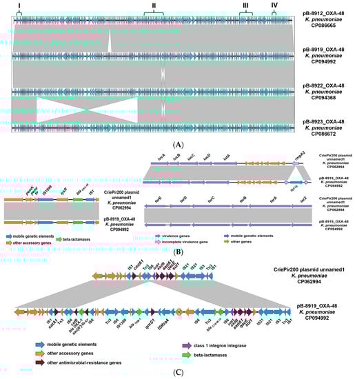 Easyfig comparison: (A) IncHI1B plasmid in four K. pneumoniae clinical strains carrying carbapenemase gene blaOXA-48 (region I), integron class 1 and beta-lactamase genes blaTEM-1, blaCTX-M-15, and blaOXA-1 (region II), virulence genes iucABCD, iutA, and rmpA2 (region III), and virulence genes terEDCDAZ (region IV); (B) genetic environments of the blaOXA-48 gene (region I) and virulence genes (regions III and IV); (C) genetic environments of beta-lactamase genes blaTEM-1, blaCTX-M-15, and blaOXA-1 (region II) in the plasmid pB-8919_OXA-48 of K. pneumoniae strain SCPM-O-B-8919 compared to the plasmid unnamed 1 of K. pneumoniae strain CriePir200 [] The arrows show the open reading frames (orfs) and their orientation.