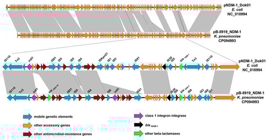 Easyfig comparison of IncC plasmids pB-8919_NDM-1 (K. pneumoniae strain SCPM-O-B-8919), pNDM-1_Dok01 (Escherichia coli strain NDM-1 Dok01), and the genetic environment of the genes blaNDM-1, blaOXA-10, and blaOXA-1. The arrows show the orfs, their length, and their orientation.