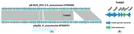 Easyfig comparison of IncFIB(pQil) plasmids (K. pneumoniae strain SCPM-O-B-8919 and K. pneumoniae strain 02288527-42B) (A). structure of transposon (Tn4401) with location of carbapenemase gene blaKPC-2 (B). The arrows show the orfs, their length, and their orientation.