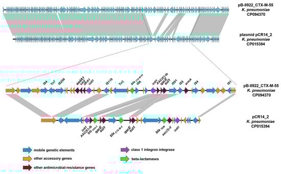 Easyfig of pB-8922_CTX-M-55 and plasmid pCR14_2 with the detailed genetic environment of the gene blaCTX-M-55. The arrows show the orfs, their length, and their orientation.