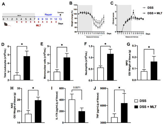 Melatonin (MLT) impairs the recovery from intestinal inflammation. Colitis was induced by exposure to 3% dextran sulfate sodium (DSS) in drinking water for 7 days. Mice were treated with MLT (10 mg/Kg) by gavage, daily, from day 3 to 12, and euthanized on day 13 for sample collection ((A), third experimental protocol).). In (B), changes in body weight related to the first day of colitis induction. (C) Daily clinical disease score and (D) total score throughout the experimental period. (E) Circulating leukocytes, (F) mononuclear cells and (G) neutrophils. In (H), intestinal permeability evaluated by detection of FITC-Dextran in sera samples. (I) IL-17A and (J) TNF levels in the gut of mice with colitis, treated or not with MLT. The cytokines are depicted in picograms per milliliter, normalized by colon weight. Results are representative of three independent experiments, with five mice/group. * p < 0.05.