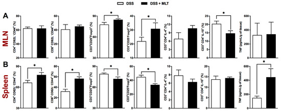 Spleen and mesenteric lymph nodes (MLN) responses in melatonin (MLT)-treated colitis. Colitis was induced by exposure to 3% dextran sulfate sodium (DSS) in drinking water for 7 days. Mice were treated with MLT (10 mg/Kg) by gavage, daily, from day 3 to 12, and euthanized on day 13 for sample collection. The frequency (%) of various immune cell subtypes was evaluated by flow cytometry in the MLN (A) and spleen samples (B). For characterization of effector memory T lymphocytes (TEM), the CD4+CD62L−CD44+ and CD8+CD62L−CD44+ populations were evaluated. The regulatory T cells were characterized by CD3+CD25+Foxp3+ and CD3+CD25-Foxp3+ staining. Identification of CD4 T cells producing IL-4 or IL-10 was also performed in CD3+CD4+IL-4+ and CD3+CD4+IL-10+ populations. The concentration of TNF in both lymphoid organs was determined and expressed in picograms per milliliter, related to the organs’ weight. These results are representative of two independent experiments with five mice per group. * p < 0.05.