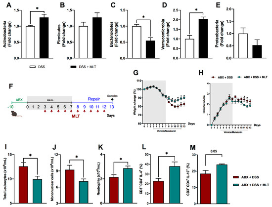 The systemic and persistent inflammation induced by melatonin (MLT) in the recovery phase of experimental colitis is reversed by microbiota depletion. The intestinal inflammation was induced by exposure to 3% dextran sulfate sodium (DSS) in drinking water for 7 days. Mice were treated with MLT (10 mg/Kg) by gavage, daily, from day 3 to 12, and euthanized on day 13 for feces collection. Real-time polymerase chain reaction was performed for detection of Actinobacteria (A), Firmicutes (B), Bacteroidetes (C), Verrucomicrobia (D) and Proteobacteria phyla (E) in fecal samples. In (F), mice were treated daily with antibiotics (ABX) for 10 days for microbiota depletion, prior to colitis induction, as described in Material and Methods (fourth experimental protocol). Afterwards, intestinal inflammation was induced by exposure to drinking water containing 3% sodium dextran sulfate (DSS) for 7 consecutive days. Mice were treated with MLT (10 mg/Kg) by gavage, daily, from day 3 to 12, and euthanized on day 13 for sample collection. (G) Weight change (%); (H) clinical disease score; (I) total circulating leukocytes; (J) frequency of peripheral blood mononuclear cells; (K) blood neutrophils. In (L,M), spleen T lymphocytes producing IL-4 or IL-10, respectively. The results are representative of three independent experiments with 5–10 mice per group. * p < 0.05.