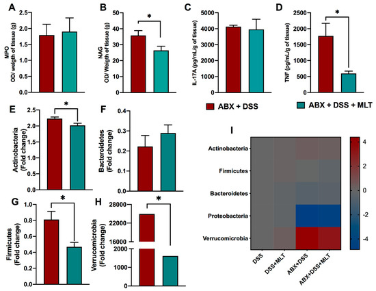 The melatonin (MLT) effects on longstanding intestinal inflammation and dysbiosis is dependent on gut microbiota. Mice were treated daily with antibiotics (ABX) for 10 days for microbiota depletion, prior to colitis induction, as described in Material and Methods. Subsequently, intestinal inflammation was induced by exposure to drinking water containing 3% sodium dextran sulfate (DSS) for 7 consecutive days. Mice were treated with MLT (10 mg/Kg) by gavage, daily, from day 3 to 12, and euthanized on day 13 for sample collection. In (A,B), colon myeloperoxidase (MPO) and N acetylglucosaminidase (NAG) activities. (C) IL-17A and (D) TNF levels in the gut of mice with microbiota depletion followed by colitis induction and MLT treatment. The cytokines are depicted in picograms per milliliter, normalized by colon weight. Relative expression of (E) Actinobacteria, (F) Bacteroidetes, (G) Firmicutes and (H) Verrucomicrobia phyla in fecal samples. (I) Heat map summarizing the alterations in the microbiota composition induced by MLT treatment in DSS colitis. The results are representative of three independent experiments with 10 mice per group. * p < 0.05.