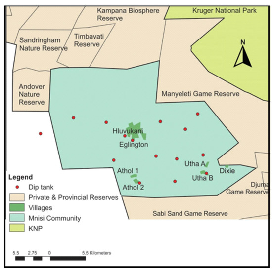 The Mnisi community (24.8205° S, 31.1710° E) is situated in the north-eastern corner of the Bushbuckridge Municipality, Mpumalanga Province, South Africa (Figure 1). The community shares 75% of its boundary with adjacent wildlife areas, including the Andover and Manyeleti provincial game reserves and the Timbavati and Sabi Sand private game reserves. There are no fences between these reserves, including the Kruger National Park (KNP), such that game can freely roam between them. Livestock farming is the main agricultural activity in the area with more cattle than any other livestock species. The project was conducted in three villages, Eglington, Utha A, and Dixie. Eglington village is in a peri-urban area, while Utha A and Dixie are located at the wildlife–livestock interface close to the border with Manyeleti provincial game reserve.