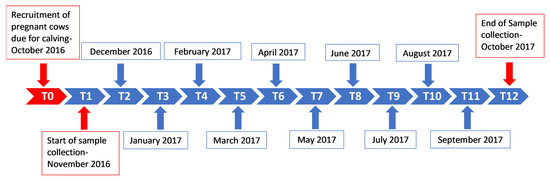 This longitudinal study was conducted between November 2016 (when the calves were 0–1-month-old) and October 2017. Whole blood samples were collected in 10 mL Vacutainer® ethylenediaminetetraacetic acid (EDTA) tubes from the ten calves once a month for 12 months according to the 12 time-point collection timeline (Figure 2).