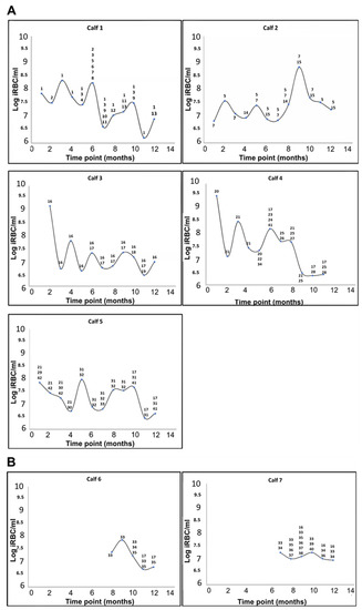 Cyclic A. marginale rickettsaemia in calves from the Mnisi community as determined by qPCR [25,34]. The level of infection is expressed as the log of infected red blood cells (RBC) per mL (iRBC/mL) of blood. (A) Calves infected with A. marginale at the peri-urban area. (B) Calves infected with A. marginale at the wildlife–livestock interface. The number and type of A. marginale msp1α genotypes detected at each time-point are indicated for each calf; genotypes were assigned numbers as shown in Table 1.
