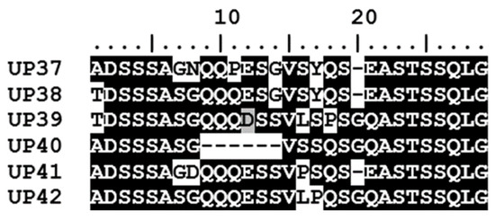 Novel Msp1a repeat sequences detected in this study. Six novel Msp1a repeats (UP37-UP42) were identified in the five calves located in the peri-urban area of the Mnisi community, Mpumalanga. Msp1a sequences were aligned using BioEdit. Conserved amino acid residues in the alignment are highlighted by white text on a black background, while variable residues are shown by black text on a white background.