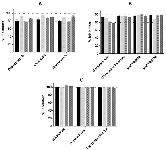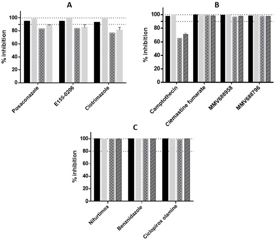 Emax values of compounds from differing chemical classes against T. cruzi intracellular amastigotes, from Tulahuen, CL, Y and G strain parasites, following 48 h incubation. (A) CYP51 inhibitors (B) camptothecin, clemastine fumarate and two compounds from the MMV Pathogen Box collection. (C) compounds which cleared 100% of parasites from host cells over all strains: the nitroheterocyclic inhibitors benznidazole and nifurtimox; and the antifungal, ciclopirox olamine. Solid bars = Tulahuen strain parasite, dotted bars = CL strain, chequered bars = Y strain, striped bars = G strain. Dashes shown at 80% and 100% activity.