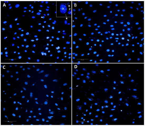 Images of 3T3 infected cells stained with the nuclear dye Hoechst, following treatment with 3.7 µM of the eukaryotic cell cycle inhibitor, camptothecin. Cells infected with: (A) Tulahuen strain (B) CL strain (C) G strain and (D) Y strain. The nucleus of parasites and host cells stained with Hoechst are shown in blue, demonstrated in (A), inset, where P = parasite nuclei, H = host cell nucleus. A mean of 19.4 ± 2.3% more infected cells was observed for the G and Y strains, in comparison to Tulahuen and CL strains, following treatment. Images taken at 20× magnification using a Phenix (PerkinElmer) imaging system.