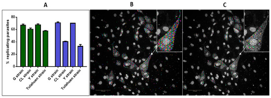 Intracellular replication of four T. cruzi strains, detected with the nucleoside analogue 5-ethynyl-2’-deoxyuridine following 48 and 72 h incubation. (A) The percentage of replicating intracellular parasites following 48 h (green) and 72 h incubation (blue). (B) Hoechst identification of intracellular Tulahuen parasites, following 72 h incubation (C) EdU identification of replicating Tulahuen parasite from the same cells as shown in (A). In (B,C) the image inset shows the difference in Hoechst and EdU identified parasites within a cell. Images taken at 20× magnification on a Phenix imaging system (PerkinElmer).