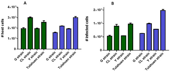3.3. Number of Infected Cells, Host Cells and Replication of T. cruzi Strains over Time