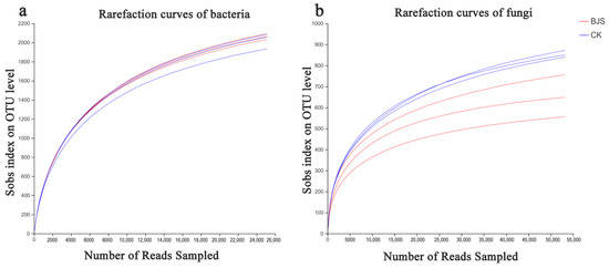A rarefaction curve of bacterial communities (a) and a rarefaction curve of fungal communities (b) showing the influence of a 3% dissimilarity cutoff on uncovered OTUs. “BJS-1-3” means BJS-1-3 fermentation-broth-treated poplar group; “CK” means sterilized fermentation-broth-treated poplar group. For each treatment, three replicates were analyzed.