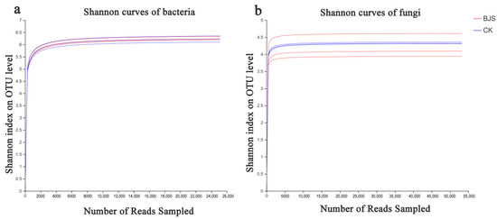 A Shannon curve of bacterial communities (a) and Shannon curves of fungal communities (b). Shannon curves illustrate the effects of a 3% dissimilarity cutoff on uncovered OTUs. “BJS-1-3” means BJS-1-3 fermentation-broth-treated poplar group; “CK” means sterilized fermentation-broth-treated poplar group. For each treatment, three replicates were analyzed.