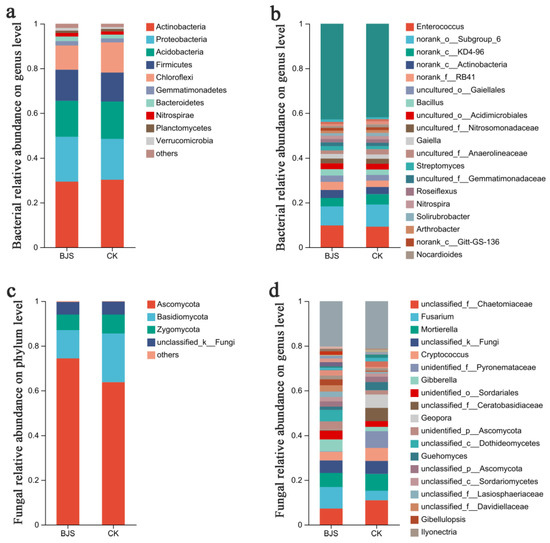 Bacterial and fungal communities in studied groups. (a) Bacterial relative abundance at phylum level; (b) Bacterial relative abundance at genus level; (c) Fungal relative abundance at phylum level; (d) Fungal relative abundance at genus level. An illustration of the relative abundances of major members in stacked bar graphs. “BJS” means BJS-1-3 fermentation-broth-treated poplar group; “CK” means sterilized fermentation-broth-treated poplar group. For each treatment, three replicates were analyzed.
