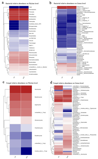 Classification of the sequences was performed using the Mothur program. Actinobacteria, Proteobacteria, and Acidobacteria were dominant phyla among both groups; they were 29.34%, 20.06%, and 16.10%, respectively, in the BJS-1-3 group, and 30.21%, 18.29%, and 16.70%, respectively, in CK group. Ascomycota and Basidiomycota were dominant phyla for both groups; they were 74.42% and 12.60%, respectively, in the BJS-1-3 group and 63.76%, and 21.78%, respectively, in the CK group. Actinobacteria, Proteobacteria, and Acidobacteria were predominant bacterial phyla based on heatmap analysis. Ascomycota and Basidiomycota were the most predominant fungal phyla (Figure 3a,c).