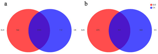 A Venn diagram illustrating the differences and similarities between the two treatments in terms of bacterial (a) and fungal (b) OTUs. “BJS” means BJS-1-3 fermentation-broth-treated poplar group; “CK” means sterilized fermentation-broth-treated poplar group. For each treatment, three replicates were analyzed.