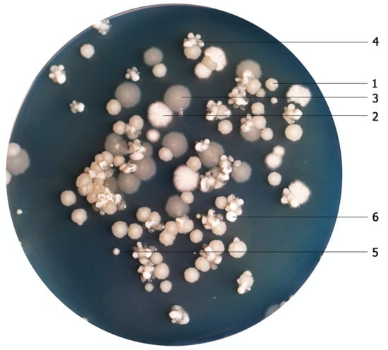 Identification of probiotic bacteria colonies detected in the course of commercial preparation analysis in the growth temperature of 45 °C. Dilution of 10−7. Cultures marked: (1) B. subtilis, (2) B. atrophaeus, (3) B. cereus, (4) B. licheniformis, (5) B. pumilus, (6) B. amyloliquefaciens.