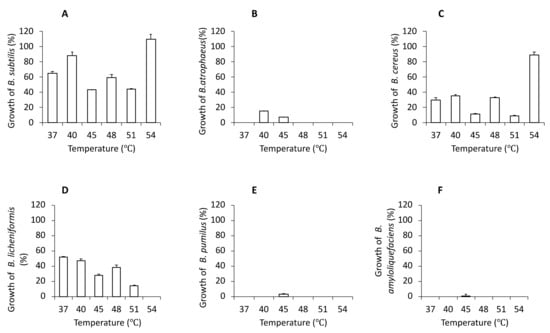 Changes of growth of Bacillus strains dependents of temperature range in triplicate. (A) B. subtilis, (B) B. atrophaeus, (C) B. cereus, (D) B. licheniformis, (E) B. pumilus, (F) B. amyloliquefaciens.