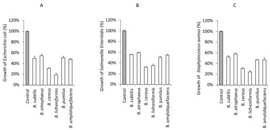 Inhibition of foodborne pathogenic bacterial growth in the presence of CFS from Bacillus strains isolated from potential probiotic source. Escherichia coli O157:H7 ATCC 35150 (A), Salmonella Enteritidis KCCM 12021 (B), or Staphylococcus aureus KCCM 11335 (C) were incubated in the presence of CFS from the Bacillus strains (B. subtilis, B. atrophaeus, B. cereus, B. licheniformis, B. pumilus, B. amyloliquefaciens) at 37 °C for 24 h. The bacterial growth was determined at OD600. The growth rate of foodborne pathogenic bacteria without CFS was assigned to 100% (Control).