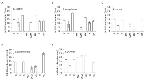 In this study, we determined whether organisms are resistant (R) or susceptible (S) to the antibiotics, as shown in Table 1. The data for triplicate incubation plates with antibiotics are presented on diagrams (Figure 5A–E). In addition, the zones of growth inhibition of Bacillus are presented in Supplementary Figure S5A–E and using the interpretative zones diameters given in Supplementary Table S3. All the isolated Bacillus species revealed resistance to ampicillin, with one exception—B. pumilus.