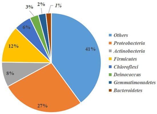 The MP FastDNA 50 mL Spin Kit for Soil (MP Biomedicals, Santa Ana, CA, USA) was used to extract genomic DNA of the samples. A maximum of 10 g of soil was used in each 50 mL Garnet Lysing Matrix tube. Due to the low microbial content, 200 g soil samples were divided into 20 portions and extracted simultaneously, following the manufacturer’s instructions. All extracted DNA was combined and then eluted by adding 1 mL of TES. Finally, agarose gel electrophoresis was used to assess the purity and concentration of the extracted DNA. The diluted genomic DNA was used as the template to amplify the bacterial flora of the sample using the universal primers 27F and 1492R, and the DNA information of the amplified products in the V3–V4 region of 16S rDNA was identified [15].