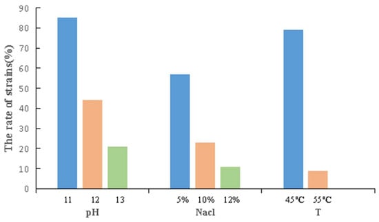 Analysis of the stress tolerance of the isolated actinobacteria showed that most of the strains had strong stress resistance, with 57% being able to grow at 5% NaCl and 85% being able to grow at pH 11.0. In addition, 79% of the strains could grow at 45 °C, and 9% could even grow at 55 °C (Figure 6).