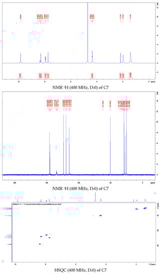 Compound C7 (Table 1) was synthesized in two steps (Figure 10). The first step is the di-halopyridine reaction which consists of an aromatic nucleophilic substitution at high temperature and without solvent to give intermediary product 3 in 78% yield [24]. This reaction is carried out with a large excess of imidazole (6.0 equivalents) and in the presence of potassium carbonate under argon at 190 °C for 18 h. The second step is a second order nucleophilic substitution reaction of 1.0 equivalent of the compound 3 with 1.0 equivalent of the dibromoheptane derivative in anhydrous acetonitrile, under argon and reflux for 7 days to give the pure product in 40% yield (Figure 12).