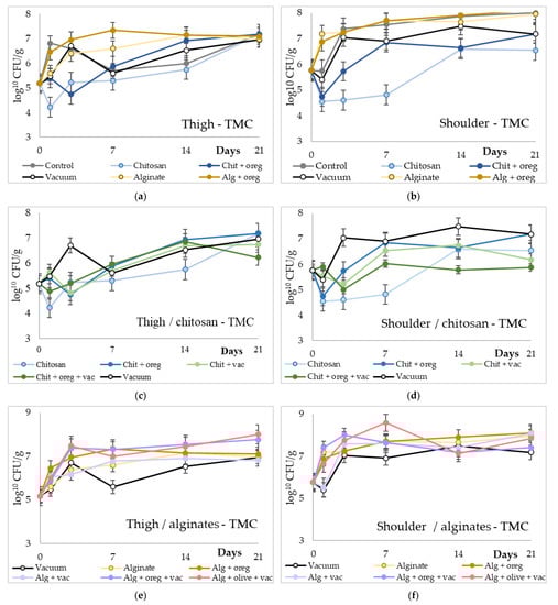 Total Mesophilic Counts (log10 cfu/g) of meat pieces over time (days). (a,b) TMC of control against chitosan or alginate coating with or without vacuum packaging in thigh and shoulder pieces; (c,d) TMC of different chitosan treatments in thigh and shoulder pieces; (e,f) TMC of different alginate treatments in thigh and shoulder pieces. (Chit: chitosan coating; oreg: oregano essential oil; vac: vacuum packaging; Alg: alginate coating; olive: olive oil addition).