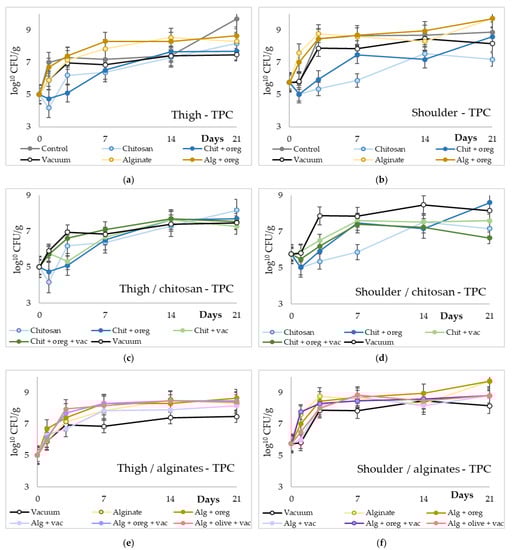 Total Psychrophilic Counts (log10 cfu/g) of meat pieces over time (days). (a,b) TPC of control lots against chitosan or alginate coating with or without vacuum packaging in thigh and shoulder pieces; (c,d) TPC of different chitosan treatments in thigh and shoulder pieces; (e,f) TPC of different alginate treatments in thigh and shoulder pieces. (Chit: chitosan coating; oreg: oregano essential oil; vac: vacuum packaging; Alg: alginate coating; olive: olive oil addition).