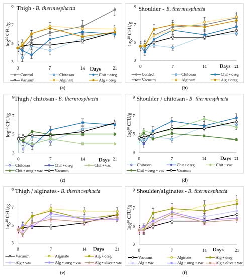 Populations of B. thermosphacta (log10 cfu/g) in meat pieces over time (days). (a,b) B. thermosphacta counts of control lots against chitosan or alginate coating with or without vacuum packaging in thigh and shoulder pieces; (c,d) B. thermosphacta counts of different chitosan treatments in thigh and shoulder pieces; (e,f) B. thermosphacta counts of different alginate treatments in thigh and shoulder pieces. (Chit: chitosan coating; oreg: oregano essential oil; vac: vacuum packaging; Alg: alginate coating; olive: olive oil addition).