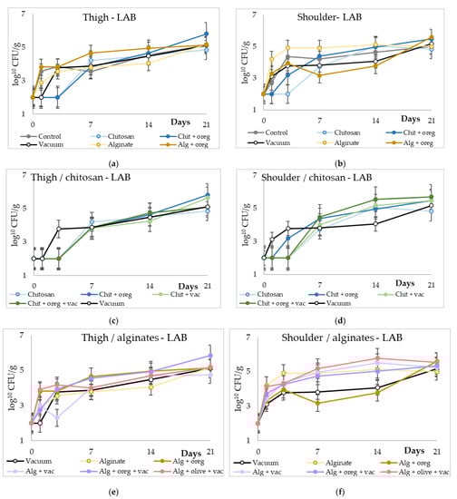 Populations of lactic acid bacteria (log10 cfu/g) in meat pieces over time (days). (a,b) LAB of control against chitosan or alginate coating with or without vacuum packaging in thigh and shoulder pieces; (c,d) LAB of different chitosan treatments in thigh and shoulder pieces; (e,f) LAB of different alginate treatments in thigh and shoulder pieces. (Chit: chitosan coating; oreg: oregano essential oil; vac: vacuum packaging; Alg: alginate coating; olive: olive oil addition).