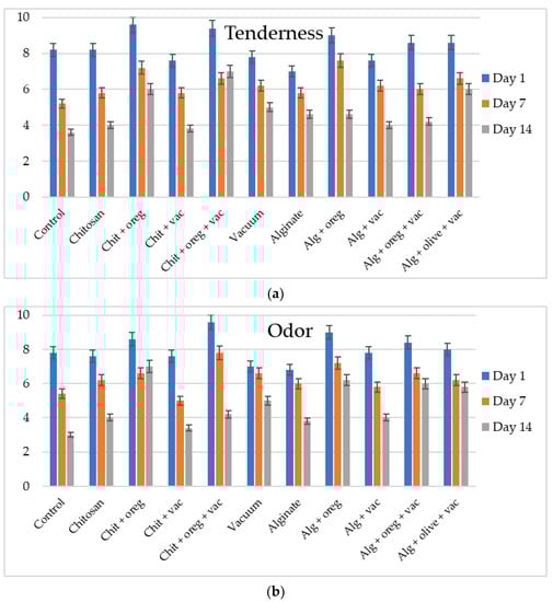 Oregano oil positively affected the organoleptic properties of meat products. Meat pieces that were coated with chitosan or alginate coatings and oregano oil and stored either aerobically or under vacuum had significantly higher sensory scores (p-value < 0.05) regarding their taste, odour and tenderness. Meat pieces were considered as unacceptable for evaluation on the 21st day of storage, due to the development of off-odour. The results of sensory evaluation are illustrated in Figure 5.