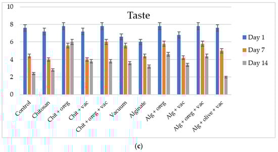 Results of sensory evaluation of meat pieces from the shoulder region over time. (Chit: chitosan coating; oreg: oregano essential oil; vac: vacuum packaging; Alg: alginate coating; olive: olive oil addition) ((a): tenderness; (b): odour; (c): taste).