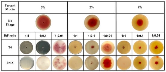 Addition of either T4 or PhiX to motility plates allowed for the examination of phage predation in the context of bacterial motility. The motility plates were most representative of a static environment where bacterial motility would be the major movement through the matrix and phage diffusion, if it occurred, would have been negligible [51,53,54]. Motility plates containing increasing concentrations of mucin (0%–4%) were infused with decreasing pfu of either phage for final bacteria:phage (B:P) ratios of 1:1, 1:0.1, and 1:0.01 (Figure 1).