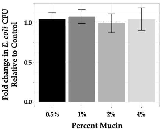 Experiments to quantify the level of phage predation by each phage under varying conditions required assurance that mucin concentrations used in our experimental conditions were not contributing to bacterial growth, as mucin has been shown to be a metabolic substrate for non-commensal E. coli [55,56,57]. As such, we quantified bacterial growth in mucin-containing samples (0.5%–4%) compared with growth in controls (LB alone) after incubation for 3 h. For in-tube experiments, experimental design, as described in the Materials and Methods section, involved plating 100 μL from a 1 mL sample volume where 103 bacteria were used for seeding. As seed bacteria were diluted from overnight culture and allowed to incubate 30 min prior to introduction of phage followed by the 3 h experimental incubation time, it was likely that bacterial samples at the termination of the experiment were in early log phase. Colony counts on control plates (from LB alone samples) were consistent with this premise as numbers ranged from 3 × 103 to 5 × 103 at the end of the experiment compared with 100 to 200 at the initiation of the experiment (data not shown). To demonstrate that mucin did not affect bacterial growth within this time frame, values found for bacterial growth in mucin were normalized to controls (set at 1 and represented by a dashed line; Figure 2) and plotted as a function of fold change. These measures demonstrated that the tested mucin concentrations did not systematically enhance bacterial growth (values in Table 2) as compared with the control media (ANOVA p-value = 0.63).