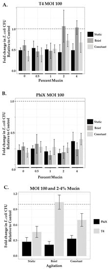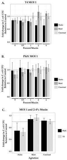 We first quantitated bacterial survival as a function of mucin concentration in static systems where bacterial motility was the dominant form of microbial movement (similar to those represented in the motility plates). Phages were added to in-tube, static assays and incubated for a shorter duration of 3 h to more closely represent potential periods of interaction within the small intestine [58]. Bacterial growth after incubation with MOI 0.1 of either T4 or PhiX was quantitated and graphed as the fold change in area of bacterial growth from phage-containing samples as compared with that from the no phage, no mucin controls (Supplementary Figure S2). As these numbers reflected no bacterial killing in any of the conditions tested, we opted to examine the effect of phages at an MOI of 1, a fold higher than the reported physiological MOI in feces [59,60].