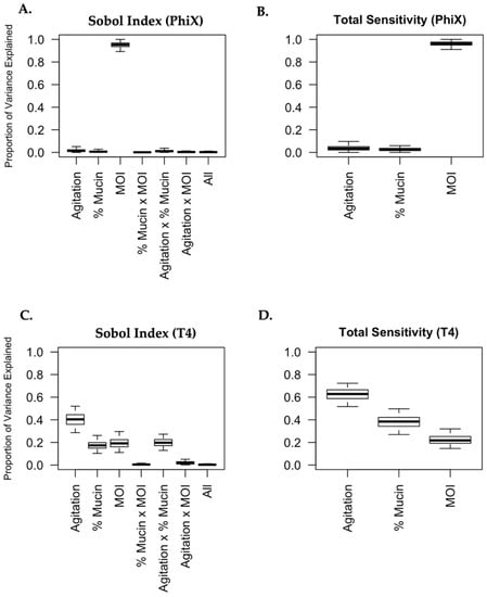 Variance-based sensitivity analysis was conducted using the Sobol method [45,46,47] to decompose the variance of phage predation into fractions (called Sobol indices), which can be attributed to predictor variables (Agitation level, % Mucin, MOI) or sets of predictor variables. Sobol indices were computed for the cases described in Section 3.7 using the approach of Francom et al. [45], which uses Bayesian multivariate adaptive regression splines to model the (possibly non-linear) relationship between phage predation and the other predictor variables. Posterior distributions of the Sobol indices were computed using the BASS package in the R programming language (version 3.6.3) [48,49,50] and are presented as boxplots.
