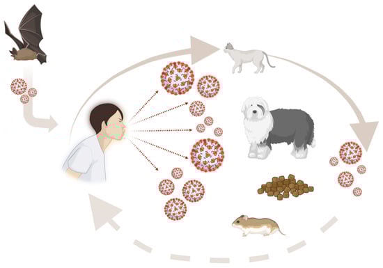 Humans, animals, and the environment play significant roles in the emergence and transmission of various infectious diseases. According to the World Health Organization (WHO), any disease or infection that is naturally transmissible from vertebrate animals to humans or from humans to animals is classified as a zoonosis (WHO) [126,127]. Anthropogenic changes in the ecosystem have resulted in an increase in shared habitats between humans and animals, offering multiple pathways of translocation for the spread of emerging infectious diseases [128]. The current literature focuses on the emerging pathogens of animal origin [5,126,129], while scientific papers rarely mention the role of humans in the variety of emerging diseases affecting the animal kingdom [130]. Currently, both animals and humans suffer from the negative effects of a changed human–animal bond; therefore, the concept of bidirectional zoonosis, that is, the transmission of high-risk and multi-resistant pathogens from humans to animals, should not be underestimated [131,132]. Indeed, a growing number of reports indicates that human pathogens can colonize and infect companion animals, thus becoming further widespread in the home environment [133,134,135]. Nowadays, 50% of owners allow their pets to lick their face; 60% of animals visit the bedroom; and 30% sleep with the owner in bed [136]. The recent trend towards closer contact between humans and animals is responsible for the increased risk of zoonotic infections through biting, licking, scratching, sneezing, or coughing, sharing the same living environment or body fluids or secretions, and indirect contact through contaminated bedding, food, water, or bites of an arthropod vector [137]. In the last two decades, the occurrence of three outbreaks of CoV with zoonotic origin has highlighted the epidemiological role of animals in a public health context. In these terms, the current SARS-CoV-2 epidemic might represent a concrete example of the consequence of the mutated human–animal and environment relationships.