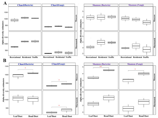Richness and diversity indices of bacterial and fungal communities were calculated from the sequencing data (Figure 1). The Chao1 richness index was lower for bacterial communities in recreational zones of both cities. The Shannon index of bacterial communities in the recreational zone of Murmansk was also lower than in other functional zones. No similar effect was observed for Moscow samples. For fungal communities, we observed a decrease in the Shannon index from the recreational zone to the traffic zone only for samples collected in Moscow. In the fungal community of Murmansk, Chao1 richness was lower in the recreational zone than in other functional zones. As for the biotope effect, the indices of Chao1 richness and Shannon diversity in the road dust were nearly always significantly higher than in the leaf dust for fungal and bacterial communities in the two cities.