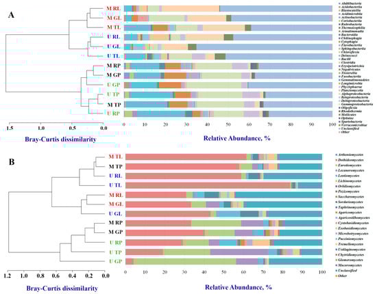 Distribution of the most abundant bacterial (A) and fungal (B) classes (read frequency > 0.1%) identified in functional zones and biotopes of Moscow and Murmansk. Unclassified phyla and phyla with relative abundance ≤0.1% were considered as “Unclassified” and “Other”, respectively. Clustering analysis of the class-level communities based on the computation of the pairwise Bray–Curtis dissimilarity matrix is also reported. The first letter in the abbreviation refers to the city: M–Moscow, U–Murmansk; the second letter refers to the functional zone: T–traffic, R–residential, G–recreational; and the last letter, to the biotope: L–leaf, P–paved surface.
