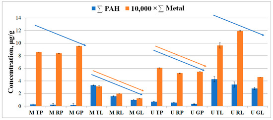 Total content of the PAHs (blue) and metals (orange) in biotopes of functional zones of Murmansk and Moscow. The first letter in the abbreviation refers to the city: M–Moscow, U–Murmansk; the second letter refers to the functional zone: T–traffic, R–residential, G–recreational; and the last letter refers to the biotope: L–leaf, P–paved surface. The data for metals were scaled down by a factor of 10,000 for visualization in the picture and compared to the dimensionality of the data for PAHs.